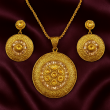 Elevate your festive look with this Gold Round Pendant Set, featuring intricately crafted circular motifs and detailed filigree patterns. The pendant is adorned with sparkling stones in concentric arrangements, paired with matching earrings that exude timeless charm. Perfect for weddings, festive celebrations, and party wear, this set adds a touch of regal elegance to any attire. Crafted with precision and finished in premium gold polish, this set is a must-have for women who love statement jewellery with a traditional yet modern appeal.