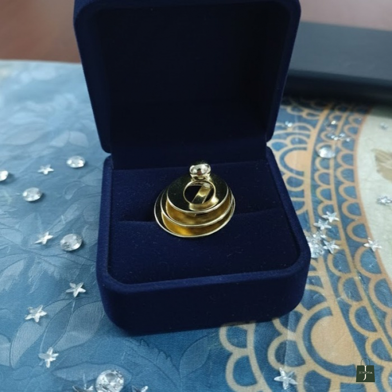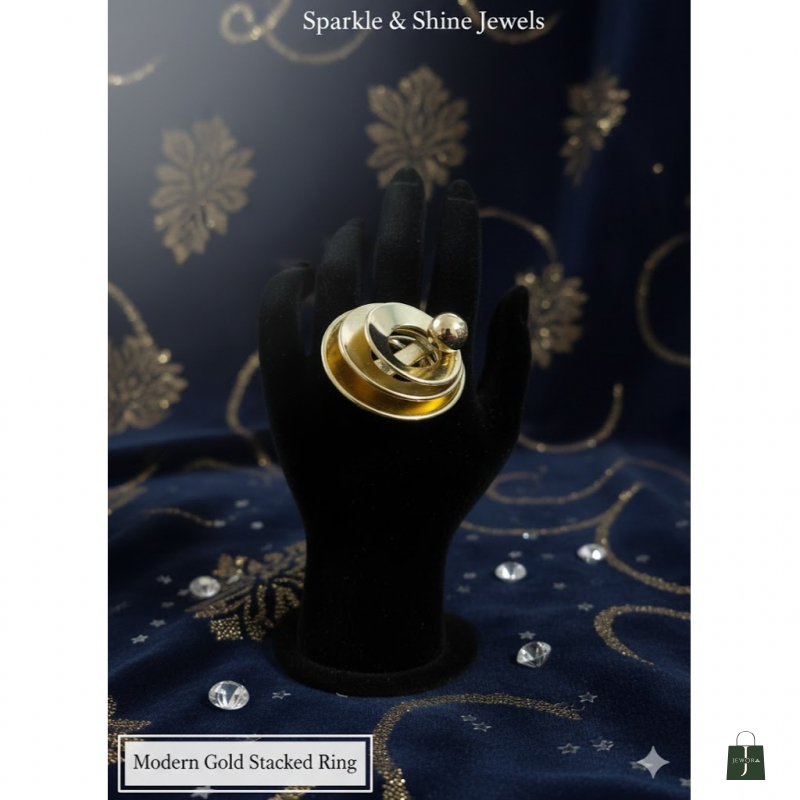 Concentric Spiral Motif: The ring features an intricate, layered design of polished gold-tone rings that create a stunning architectural look.