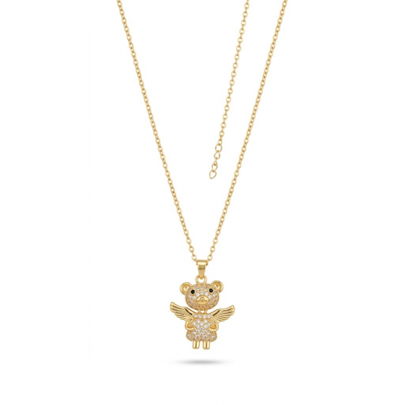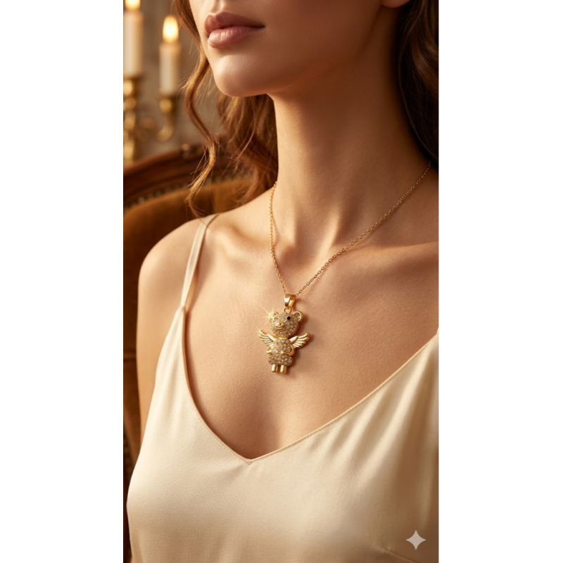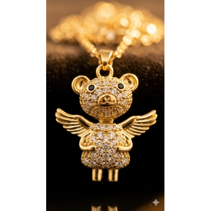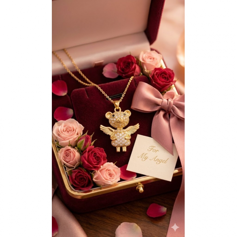 Celebrate love, affection, and special moments with this beautifully crafted Teddy Angel Pendant Necklace. Designed with a charming teddy bear featuring delicate angel wings, this necklace symbolizes care, protection, and endless love. The pendant is intricately studded with sparkling crystals, giving it a luxurious and eye-catching shine.