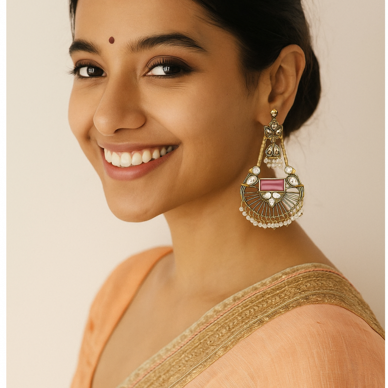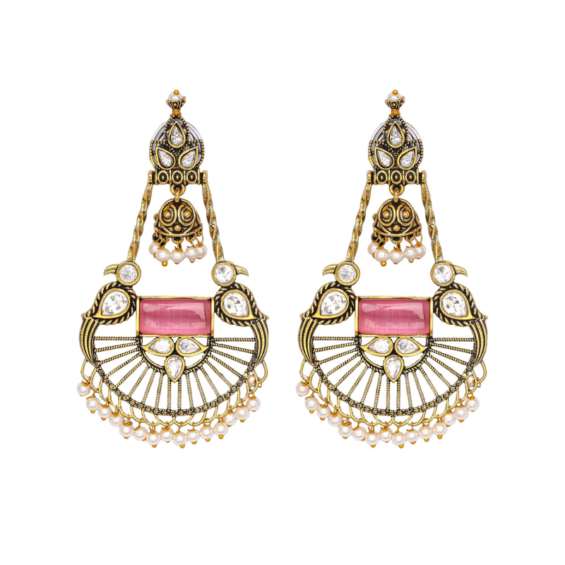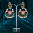 This earrings with a mehandi polish, pink stone, kundan, motifs Jhumkas,The earrings feature a layered design with a chand bali