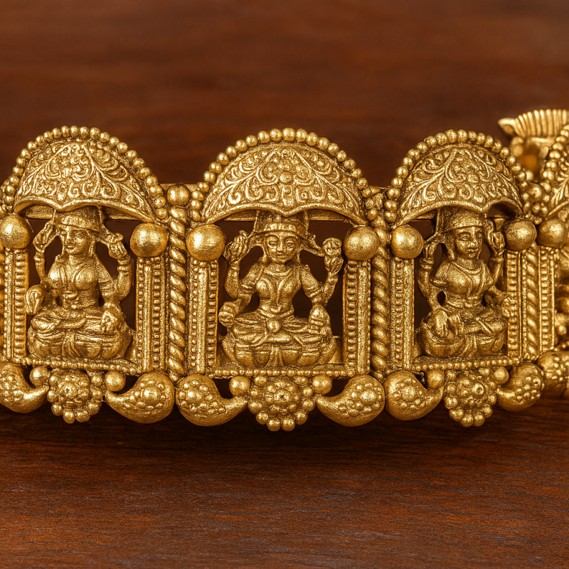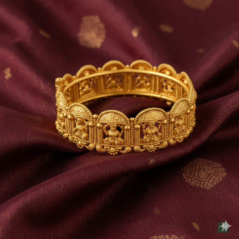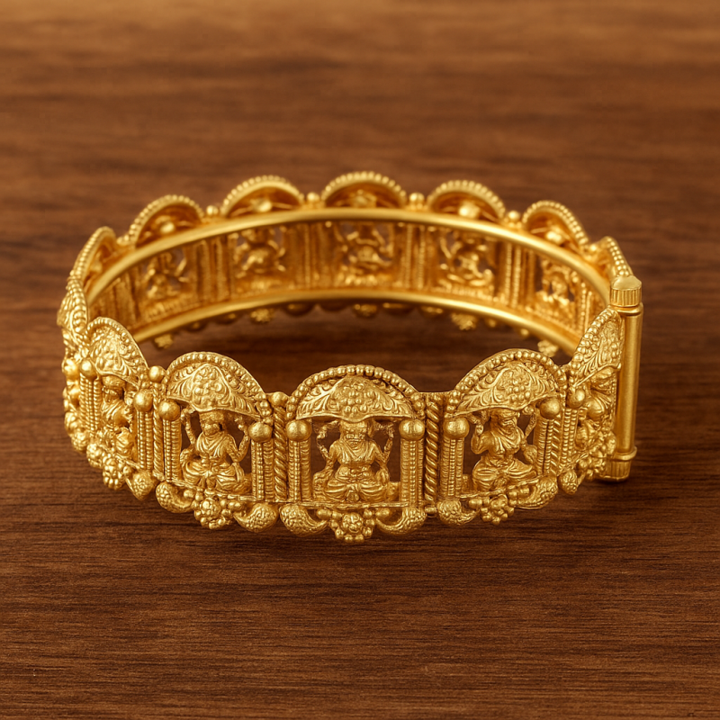 Gold Temple Deity Kada Bangle is a masterpiece of traditional temple jewellery, intricately crafted with divine deity motifs. Each panel of the kada features miniature sculpted idols under arched domes, symbolizing heritage craftsmanship and cultural devotion. The elaborate design adds grandeur, making it a perfect statement piece for traditional occasions.