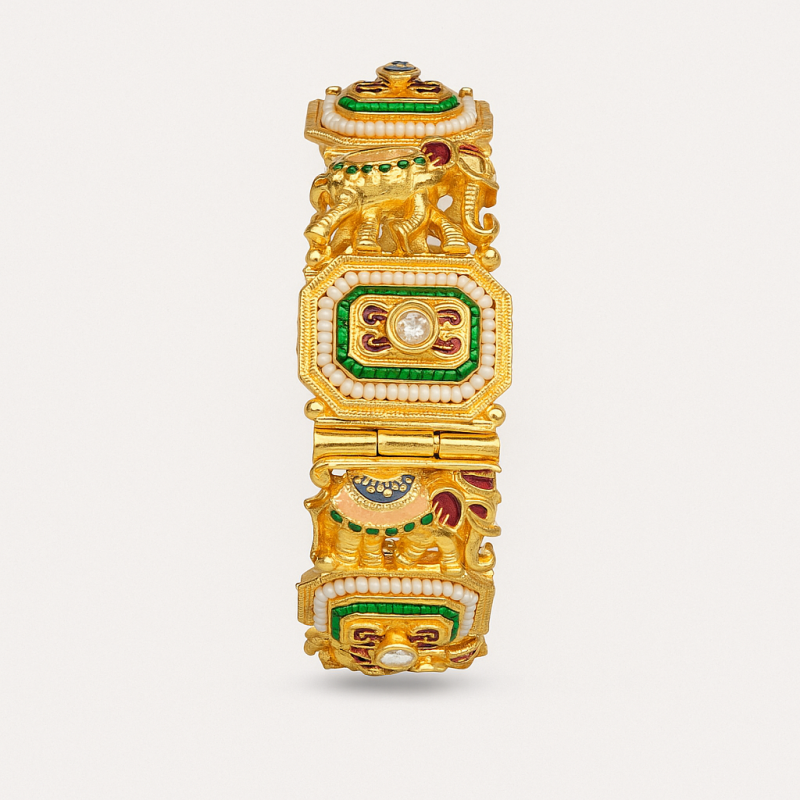 Elevate your ethnic look with this Gold Temple Jadau Kada, a masterpiece of traditional craftsmanship. Featuring exquisite temple-style motifs and intricate jadau work, this kada is adorned with multicolor accents of green, red, and pearls. The detailed carvings and embossed design reflect heritage artistry, making it perfect for bridal wear, festive occasions, and cultural celebrations. Its bold, regal appeal makes it a statement piece in any jewellery collection. Shop this premium kada at Jewora, your destination for timeless artificial jewellery.