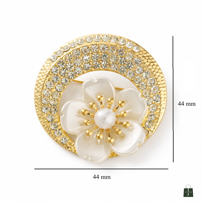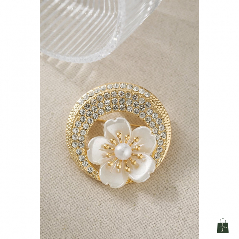 ELEGANT DESIGN: Features a stunning gold-tone circular brooch adorned with sparkling rhinestones and a delicate white enamel flower with pearl centre for a sophisticated look