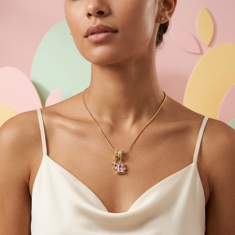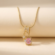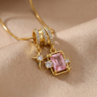 Main Pendant: A rectangular, emerald-cut pink gemstone (likely zircon or synthetic sapphire) set in a gold frame. The frame features delicate star-like prongs and small clear accent stones on the sides.