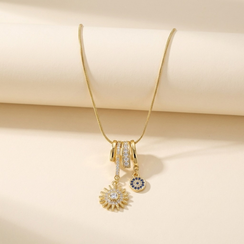 Symbolic Artistry: Each charm is meticulously detailed, from the deep blue "iris" of the protective eye to the radiant multifaceted centerpiece of the sunburst.