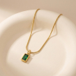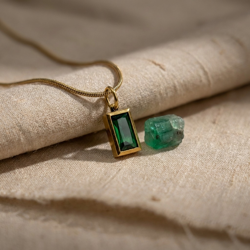 The Pendant: A striking emerald-cut green gemstone (likely zircon or crystal) set in a classic bezel setting. The rectangular, step-cut facets of the stone provide a deep, architectural clarity.