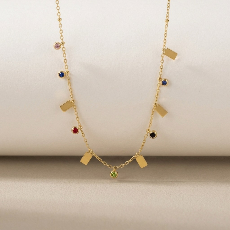 Celebrate every facet of your personality with the Spectrum Charm Necklace. This vibrant piece features a rhythmic arrangement of polished gold bar charms interspersed with brilliant, multi-colored bezel-set stones. From deep sapphire blues to emerald greens and ruby reds, this necklace is designed to be a wearable celebration of light and color.
