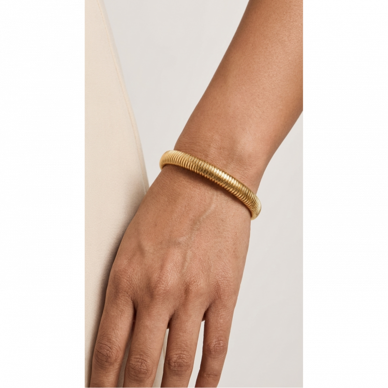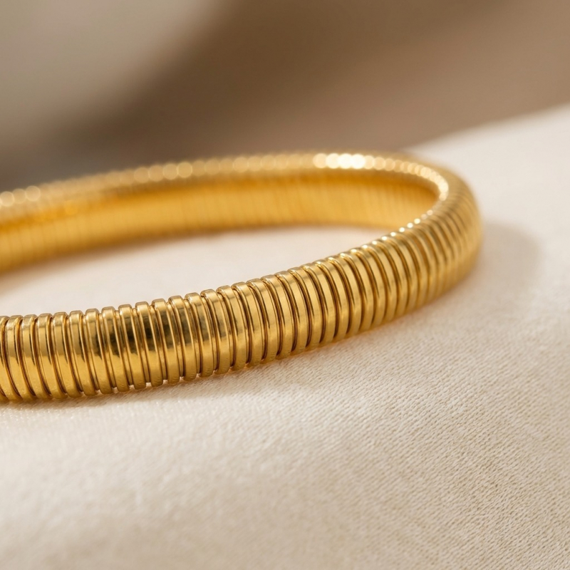 Experience the perfect fusion of strength and elegance. The Aurelian Serpent Bangle features a sophisticated, ribbed-tubogas design that wraps the wrist in a continuous flow of high-polish gold. Its flexible, spring-like structure offers a modern, tactile aesthetic that feels as luxurious as it looks.