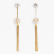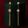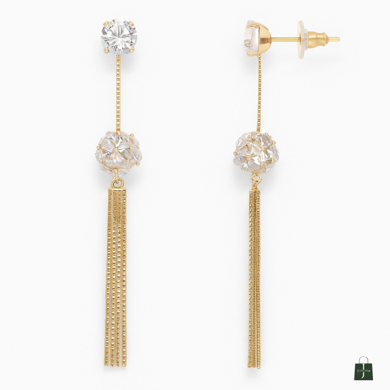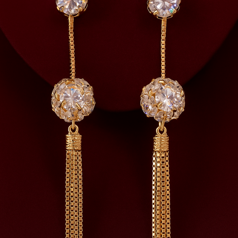 Elevate your style with these stunning Gold White Diamond Tassel Earrings, designed to add sparkle and movement to any outfit. Featuring high-quality American Diamond (CZ) stones set in a gold-plated base, these earrings exude elegance and charm. The tassel design creates a chic, elongated silhouette, making them perfect for parties, festive occasions, or glamorous evenings out.