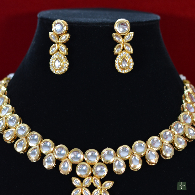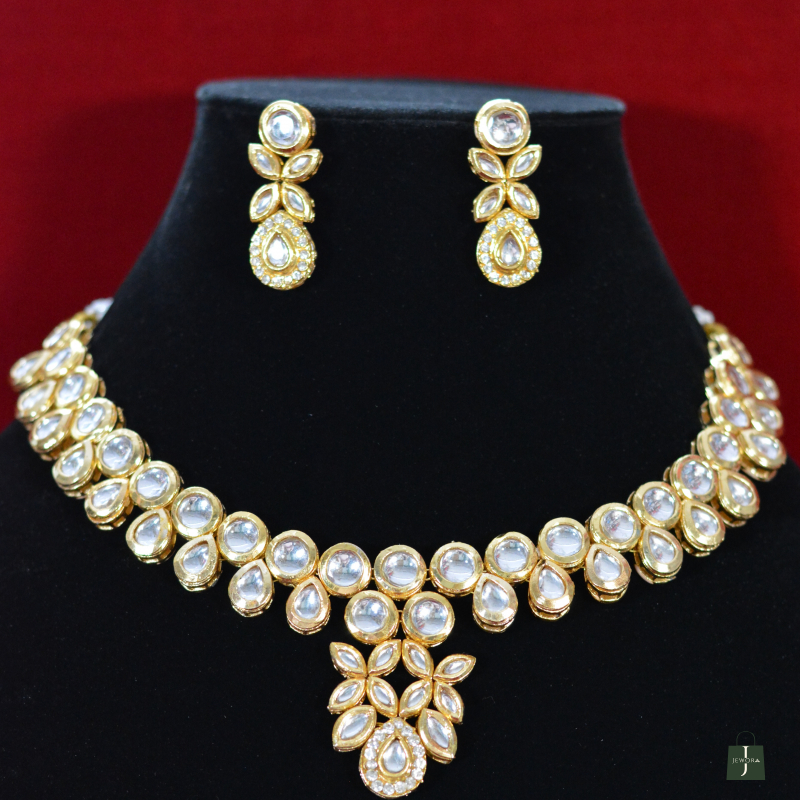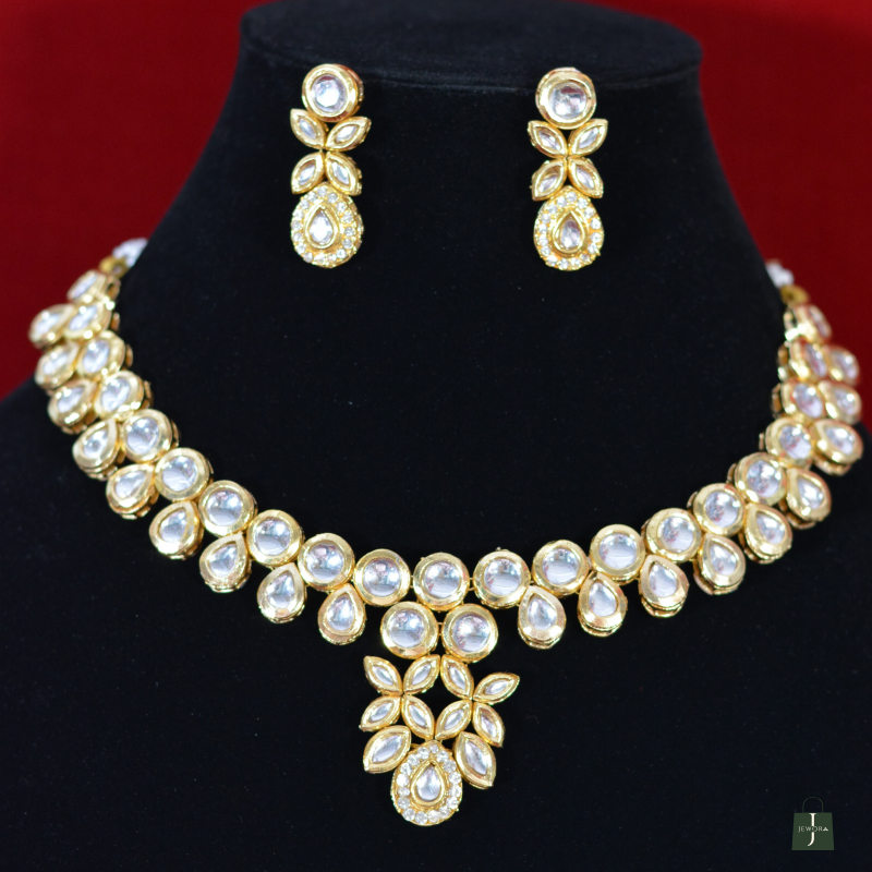 Inspired by nature, this Golden Aura Polki leaf pendant necklace set combines graceful leaf motifs with radiant Polki stones. The refined design creates a premium visual appeal without heaviness, making it suitable for both traditional ceremonies and elegant day events at an affordable luxury price.
