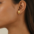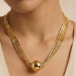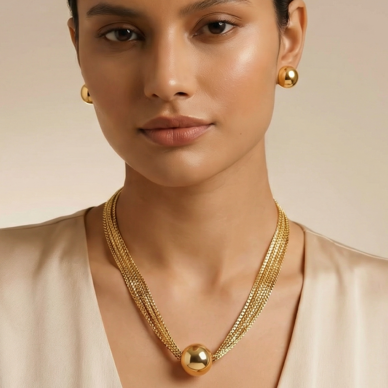 Multiple box chains flow together in perfect harmony, their uniform links creating a sleek, architectural line along the neckline. At the center, a smooth golden sphere anchors the design with soft brilliance, adding balance and depth without excess. Matching metal post earrings echo the same sculpted form, framing the face with understated grace.