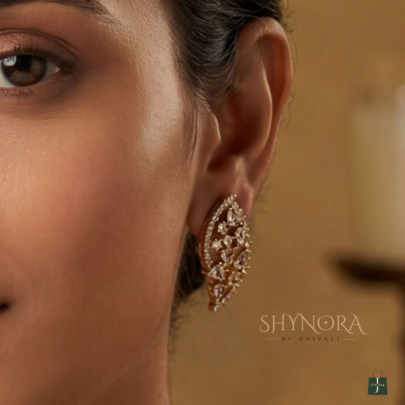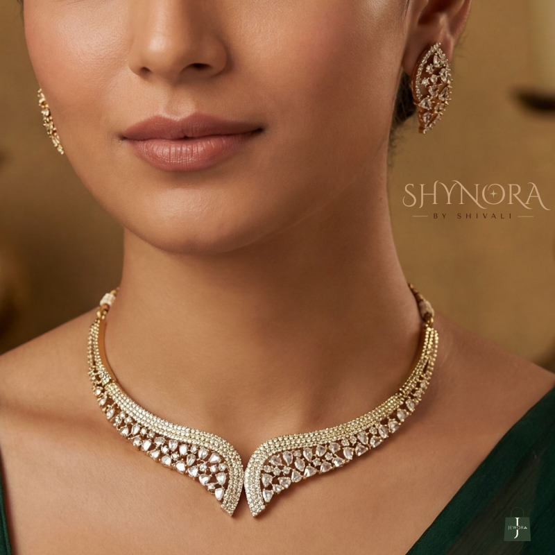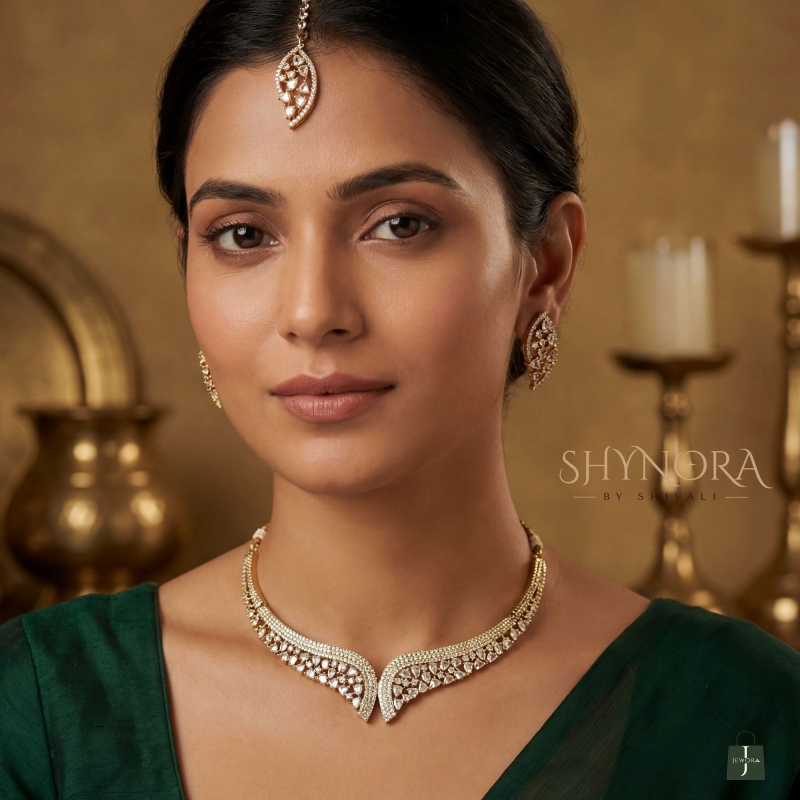 This Golden BIG Leaf American Diamond Choker Set features a sleek V-shape leaf design with fine sparkling AD stones. The elegant curved pattern gives a modern yet graceful look, perfect for minimal bridal wear and classy festive styling.