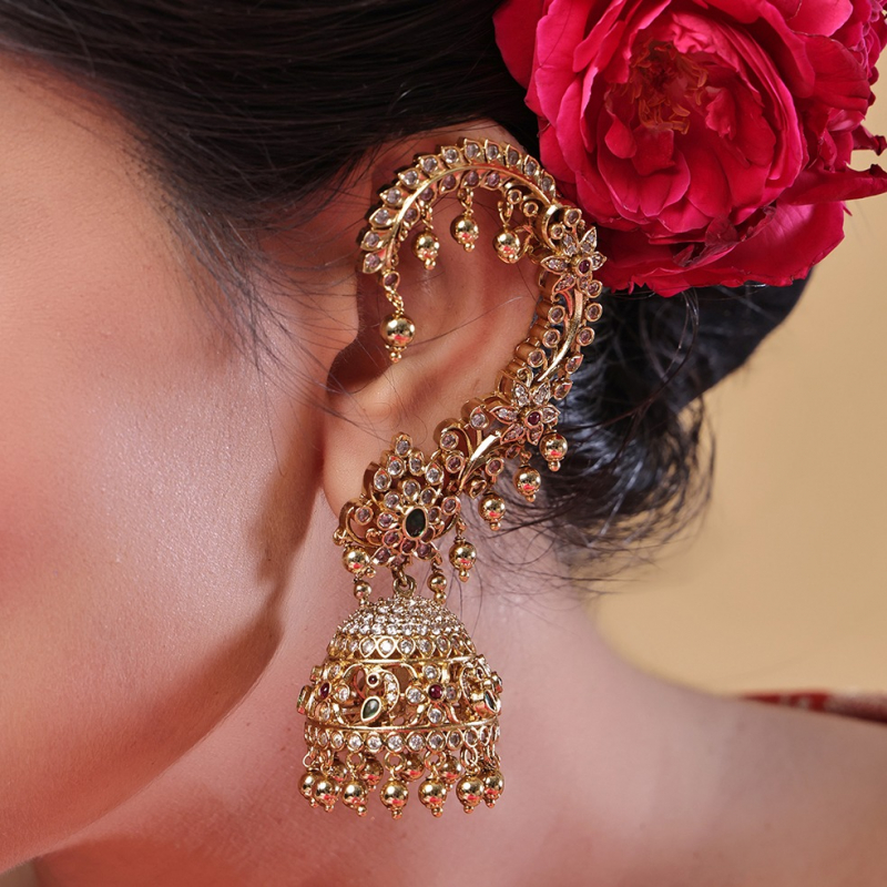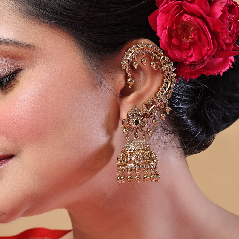 Enhance your ethnic charm with these Golden Blossom Kundan Ear Cuff Earrings, beautifully designed with intricate leaf and floral motifs. Crafted in a rich gold polish, these earrings feature a graceful ear cuff style that elegantly traces the curve of the ear. The kundan-style stones add a regal sparkle, giving the illusion of fine traditional craftsmanship. Delicate detailing and a lightweight structure make them comfortable for long wear. Perfect for weddings, festive occasions, or statement styling, these earrings blend nature-inspired artistry with royal elegance. Pair them with ethnic or fusion outfits to create a sophisticated and eye-catching look effortlessly.