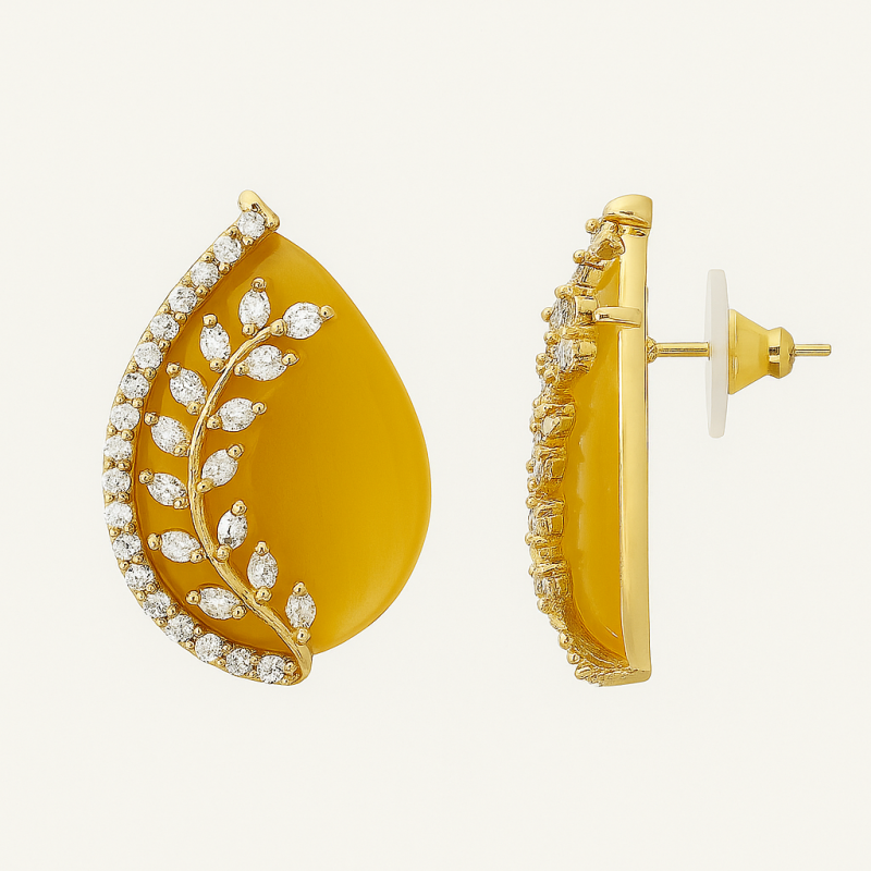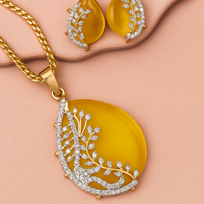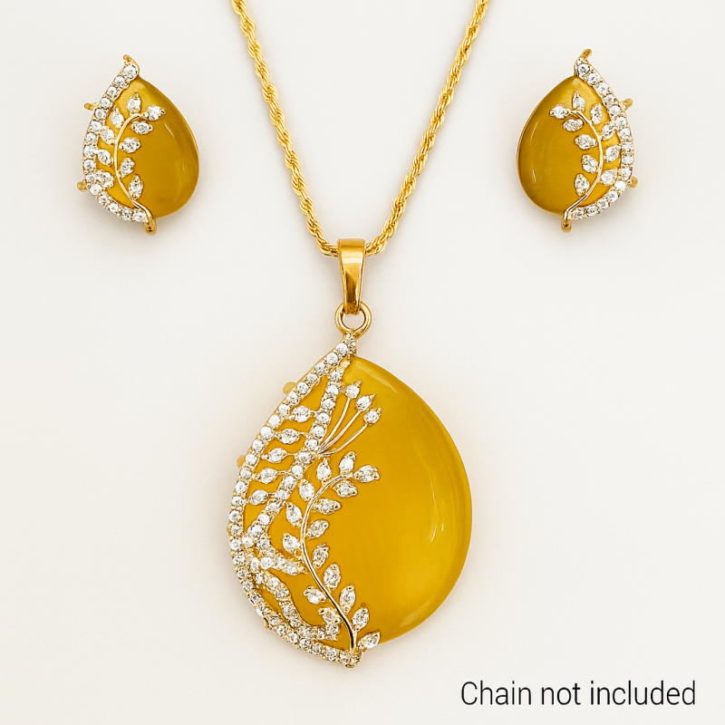 Elevate your elegance with the Golden Blossom Leaf Pendant Set, crafted with a vibrant yellow gemstone that radiates warmth and charm. The pendant and earrings are beautifully adorned with delicate leaf motifs, encrusted with shimmering American Diamond (CZ) stones, making this set an ideal choice for festive and party occasions. The gold plating enhances its regal appeal, giving you a sophisticated and striking look.