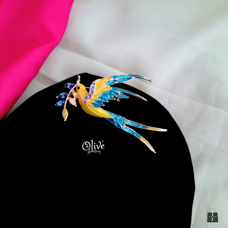 Bring a pop of colour and elegance to your outfit with this stunning Multicolour Enamel Swallow Bird Brooch Pin. Designed with flowing lines and detailed enamel work, this brooch features a graceful bird in mid-flight holding a delicate branch adorned with sparkling stones. The harmonious blend of yellow, teal blue, and gold tones makes it a cheerful yet refined accessory, perfect for adding personality to coats, dresses, scarves, or handbags.