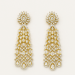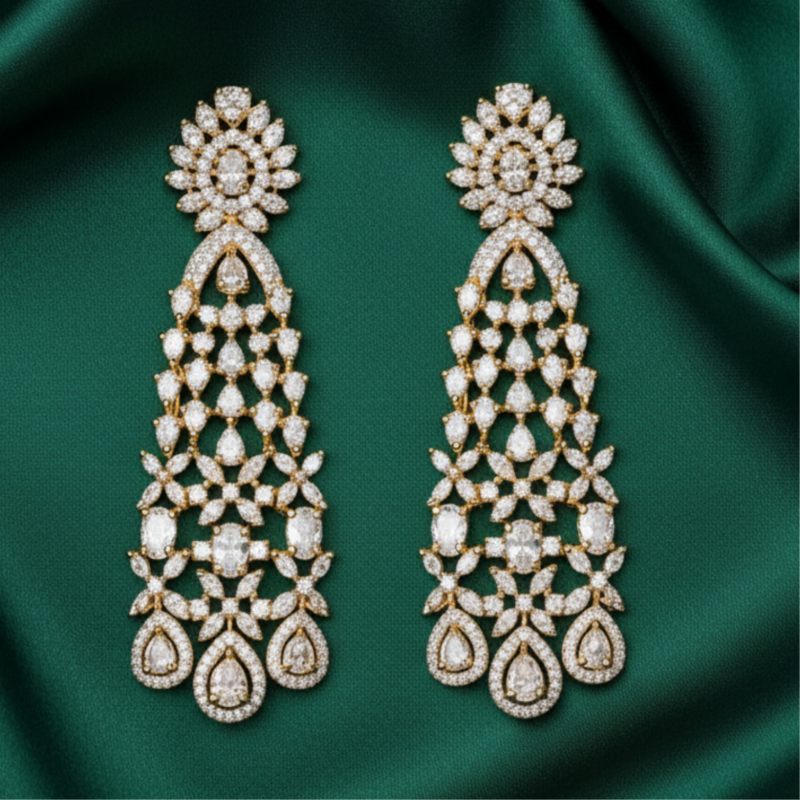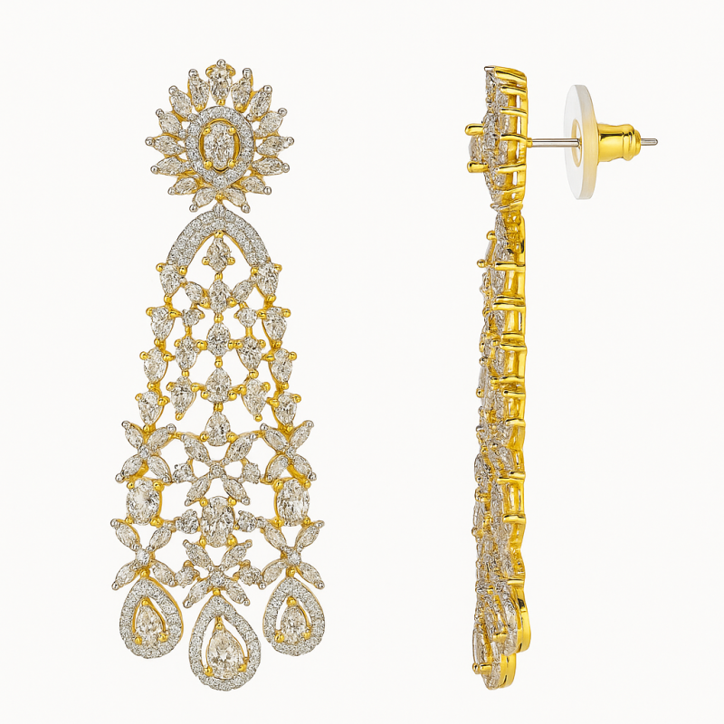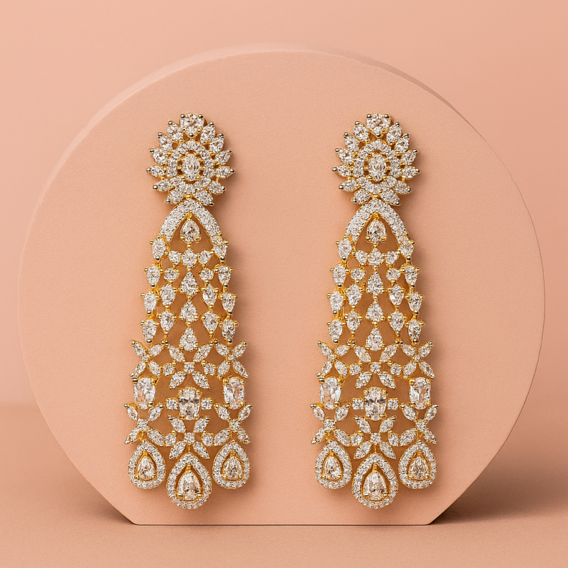Add a regal touch to your festive or bridal attire with this stunning golden diamond drop earring. Crafted in a striking lattice design, the earring features a graceful cascade of shimmering American Diamonds, accentuated with a luxurious gold polish. The intricate craftsmanship highlights a blend of classic and modern aesthetics, making it perfect for weddings, festive celebrations, and grand occasions. Its elongated drop silhouette with pear-shaped stone motifs at the base ensures a statement-making appearance, while the golden accents enhance its elegance. Designed to capture the light from every angle, this earring exudes unmatched brilliance and glamour. Pair it with traditional outfits like lehengas or sarees, or use it as a standalone accessory to elevate your overall look. A must-have masterpiece for women who love grandeur with sophistication.