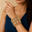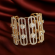 Add a touch of glamour to your look with the Golden Floral Link Statement Cuff Bracelet. This wide open-cuff design features multiple vertical links adorned with brilliant American Diamond (CZ) stones and highlighted by dazzling floral-shaped motifs at regular intervals. The warm gold finish gives it a luxurious appeal, making it perfect for festive occasions, weddings, or evening parties. Lightweight yet eye-catching, this bracelet strikes the right balance between elegance and boldness. Style it with ethnic outfits, gowns, or Indo-western looks for a sophisticated statement. Discover this premium piece only on Jewora โ Indiaโs #1 Artificial Jewellery Marketplace.