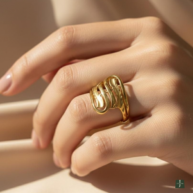 A minimalist gold ring with smooth, flowing curves that wrap gracefully around the finger. Its sculptural design gives a modern, elegant look that’s easy to wear every day or style for special occasions.