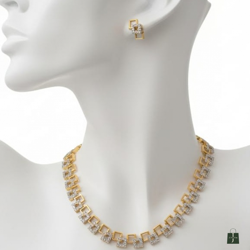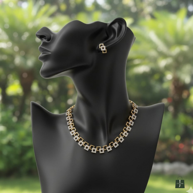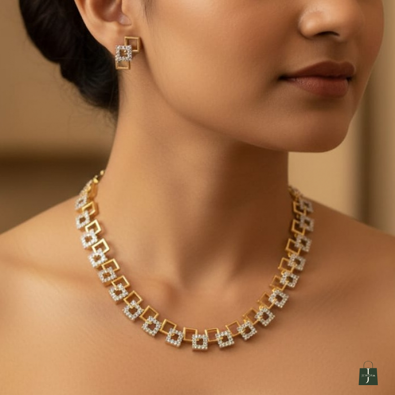Make a refined yet striking statement with this geometric-inspired necklace and matching earrings set. Designed with interlinked square motifs, the necklace blends sleek gold-tone frames with crystal-studded square accents for a sophisticated layered effect.