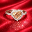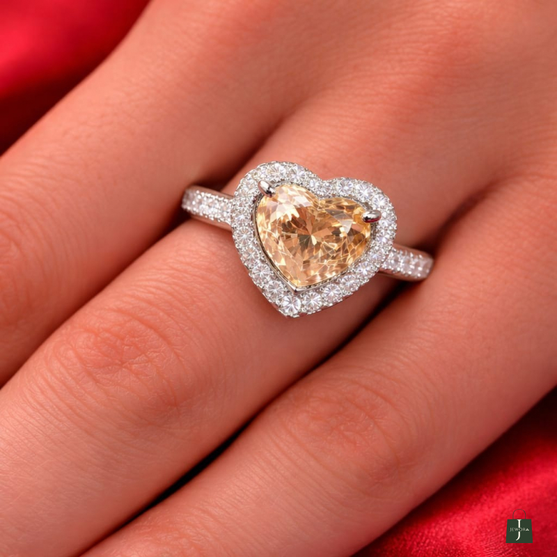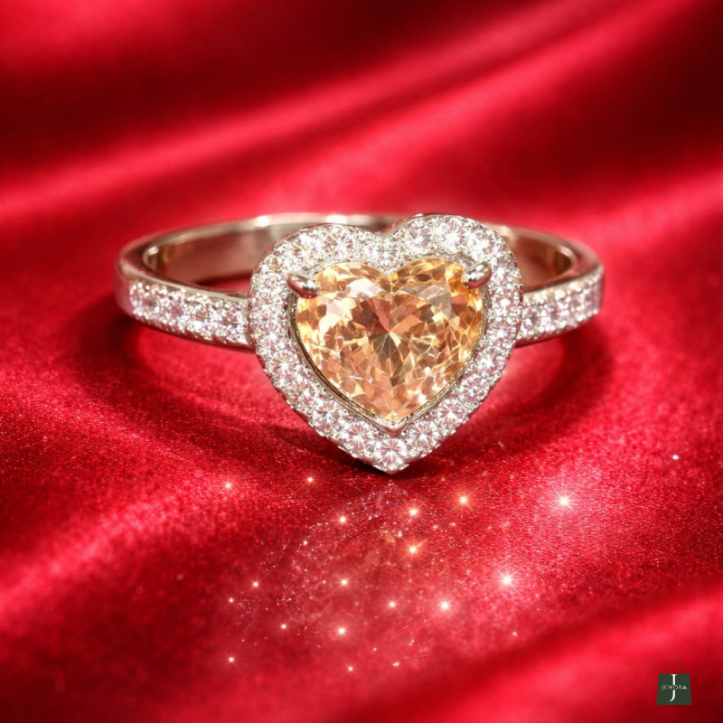 This heart-shaped golden stone is beautifully embraced by a shimmering diamond halo and set on a delicate pavé band. Designed to capture attention and radiate warmth, elegance, and timeless romance.