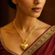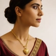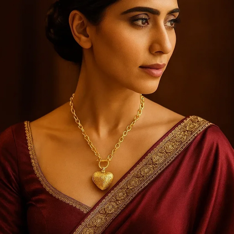 Elegant and meaningful, Ushve’s Golden Heart Pendant Necklace captures the beauty of timeless romance in a refined design. Suspended from a sleek gold-tone chain, the softly textured heart pendant rests gracefully along the neckline, creating a warm and sophisticated focal point. The delicate craftsmanship highlights the gentle curves and subtle detailing of the heart motif, symbolizing love, connection, and enduring elegance. Its polished gold finish adds a soft glow that enhances both traditional and contemporary outfits. Designed to be lightweight and comfortable, this necklace is perfect for everyday wear while still carrying enough presence for special occasions. Whether paired with a saree for festive celebrations or styled with modern outfits for daily elegance, it effortlessly elevates your look. Crafted with Ushve’s signature blend of thoughtful design and accessible luxury, this heart pendant necklace is more than just jewellery — it is a timeless keepsake meant to be worn close to the heart.
