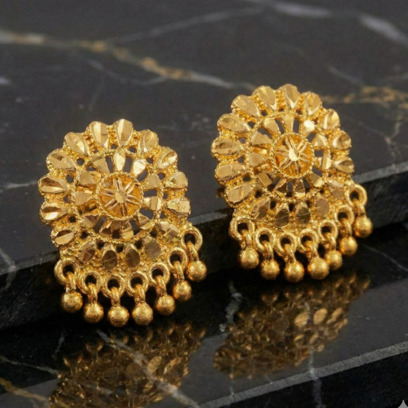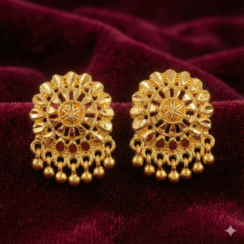 Enhance your festive look with this beautiful gold stud earring collection featuring unique designs crafted with attention to detail. The earrings include floral motifs, textured circular patterns, and crystal-studded styles that create a balanced combination of elegance and charm.