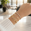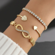 Elevate your wrist game with the Golden Infinity Heart Luxe Bracelet Stack, a beautifully curated set designed to blend elegance with modern charm. This stack features a stunning infinity symbol bracelet adorned with shimmering stones, paired with delicate heart-accent bangles that add a romantic touch. The combination of sleek gold finishes and sparkling details creates a perfect balance of minimal and statement styling. Ideal for both daily wear and special occasions, these bracelets can be worn together for a layered look or separately for subtle sophistication. Lightweight and comfortable, this set enhances any outfit with a refined glow, making it a perfect addition to your jewelry collection or a thoughtful gift for someone special.