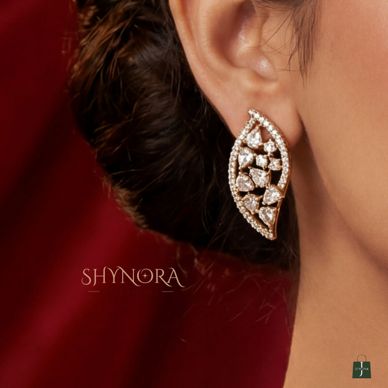 This Golden Leaf American Diamond Choker Set features a sleek V-shape leaf design with fine sparkling AD stones. The elegant curved pattern gives a modern yet graceful look, perfect for minimal bridal wear and classy festive styling.