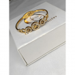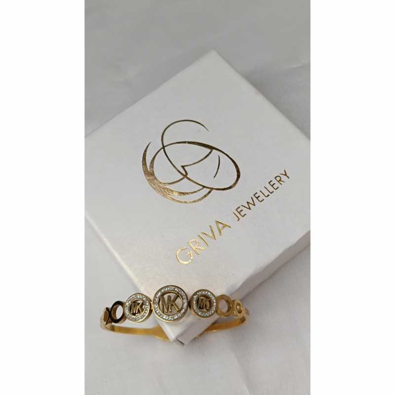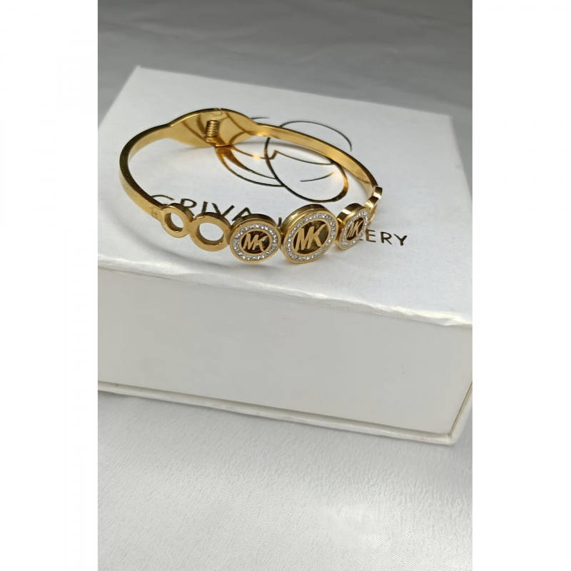 A chic designer bracelet featuring gold-toned metal with sparkling circular MK emblems. Its luxurious shine and sleek design make it a perfect accessory for both everyday wear and special occasions, adding a touch of class and sophistication to your style.