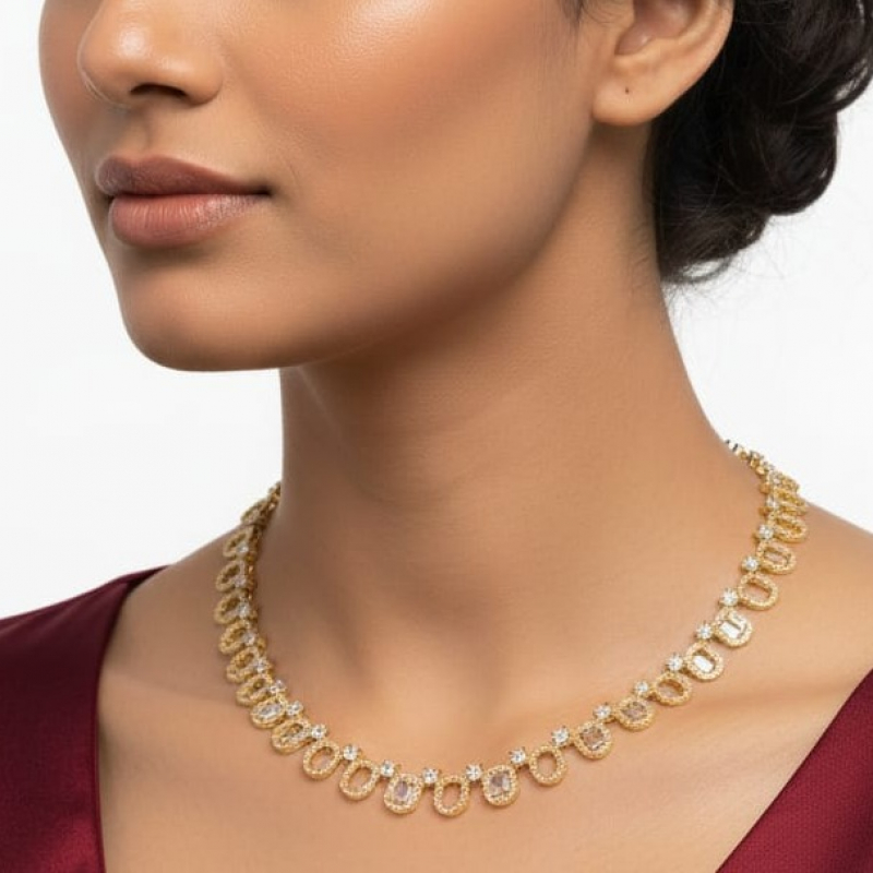 The Golden Orbit Luxe Necklace Set is a sophisticated and modern jewelry set crafted for lovers of minimal luxury. Featuring a series of interlinked circular gold-tone motifs, each highlighted with sparkling clear crystal stones, this set delivers a sleek, contemporary look with a touch of glamour. Perfect for office wear, evening parties, festive occasions, and elegant gifting.