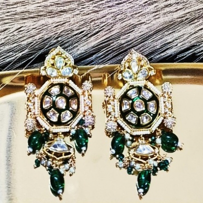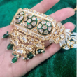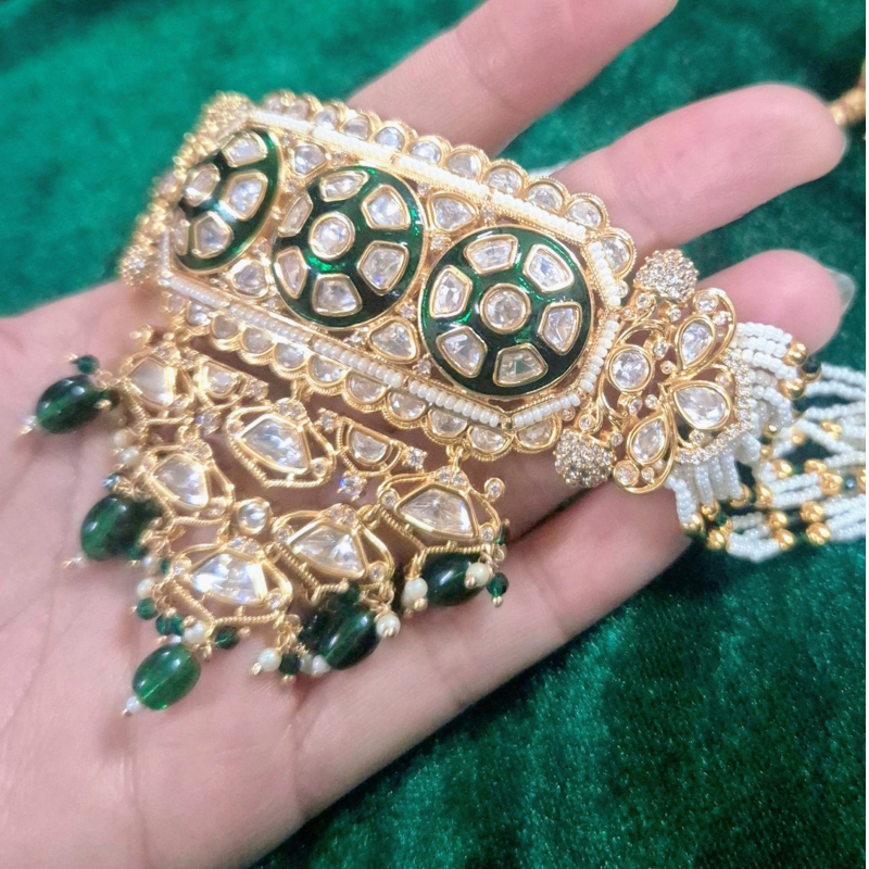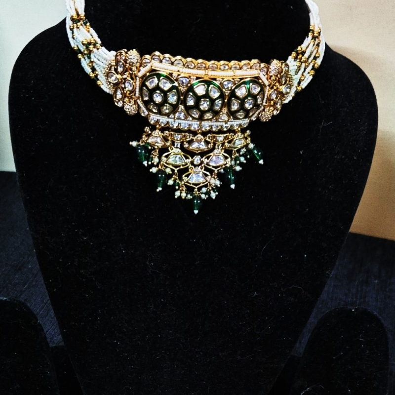 Embrace bridal elegance with the Golden Pearl Emerald Choker, a stunning piece crafted to reflect timeless tradition and royal charm. Designed in a rich gold polish, this choker features lustrous pearls and delicate bead detailing that enhance its graceful beauty. Accentuated with deep emerald green elements, it creates a striking contrast that feels both regal and sophisticated. The intricate design sits beautifully along the neckline, making it perfect for bridal wear and grand festive occasions. Finished with a comfortable dori thread closure, it offers an adjustable fit while adding a touch of classic heritage to your overall look.