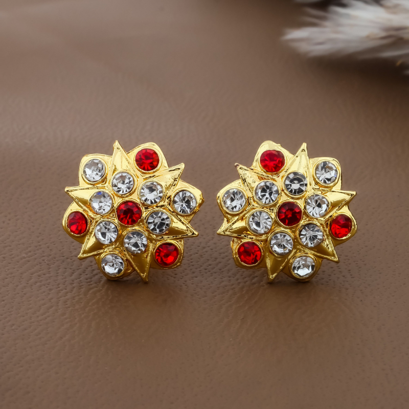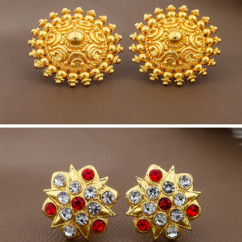 Bring elegance and versatility to your accessory collection with this gold-plated stud earrings combo pack designed for modern women. The set includes six unique pairs, each crafted with intricate detailing and eye-catching patterns. From radiant sunburst designs to classic floral styles and textured gold studs, every pair offers a distinctive look. The rich gold finish provides a luxurious appearance while the lightweight construction ensures comfortable wear throughout the day. Sparkling stones enhance the beauty of certain designs, making them perfect for festive occasions and celebrations. Whether paired with sarees, salwar suits, kurtis, or western outfits, these earrings add charm and sophistication to your overall style.