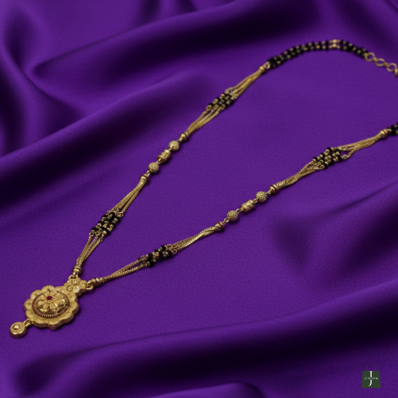 Elevate your traditional attire with this exquisite floral-inspired mangalsutra. It features a sophisticated triple-strand gold chain accented by meticulously crafted gold beads and auspicious black charms. The centerpiece is a radiant flower-shaped filigree pendant with a subtle ruby-colored highlight, offering a soft, romantic aesthetic that beautifully honors timeless cultural heritage.