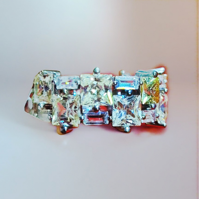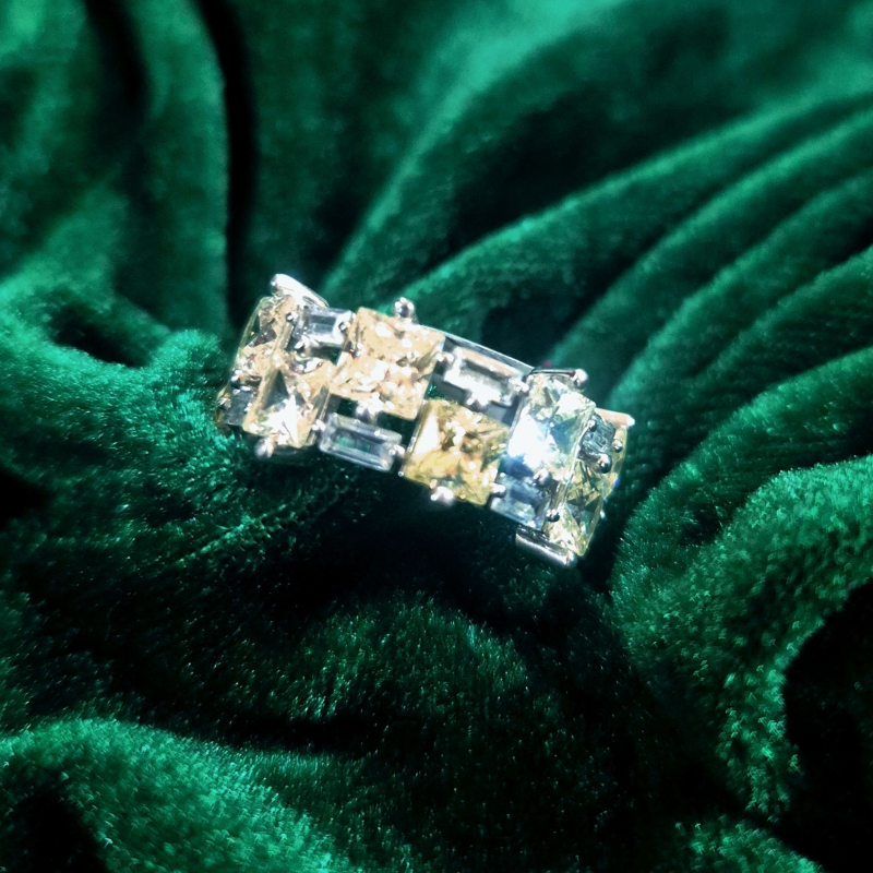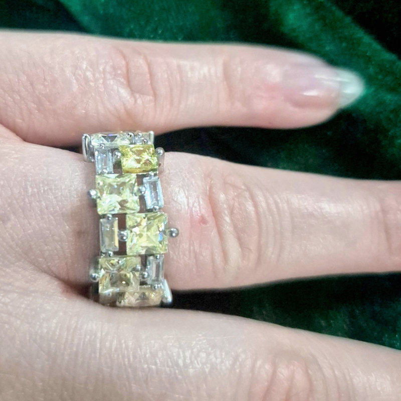 Elevate your jewelry collection with the Golden Prism Luxe Band Ring, a stunning piece that beautifully blends modern geometry with timeless sparkle. Designed with a sequence of precisely cut rectangular and square stones, this ring creates a dazzling prism effect that reflects light from every angle. The warm golden tones paired with icy clear accents make it a versatile accessory—perfect for both everyday elegance and special occasions. Set on a sleek band, this ring embodies sophistication, making it an ideal statement piece for those who appreciate refined luxury with a contemporary twist.