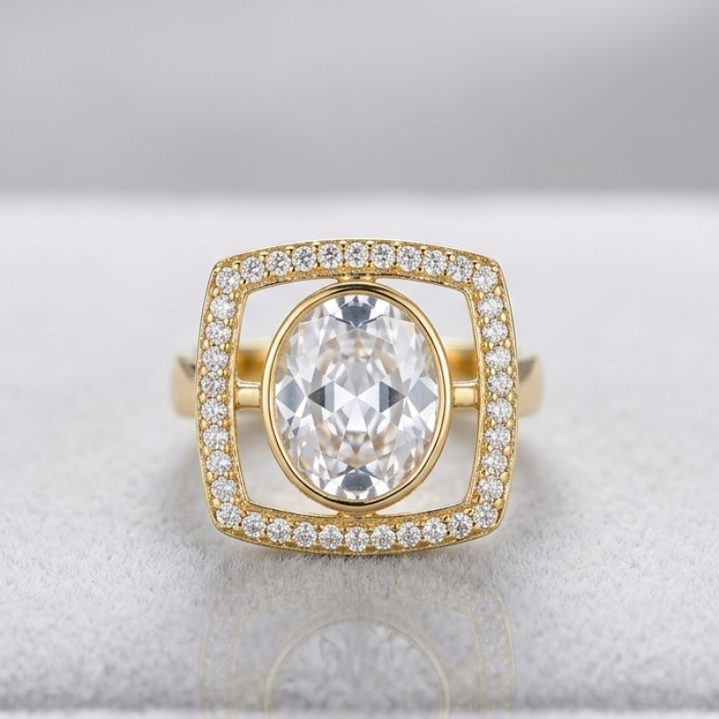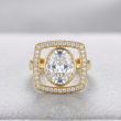 A stunning gold ring featuring a large, oval-cut white gemstone set in a four-prong bezel, surrounded by a sparkling halo of tiny white diamonds encircling the centerpiece. The luxurious design highlights the vivid stone, making it a statement piece for elegant everyday wear or special occasions.