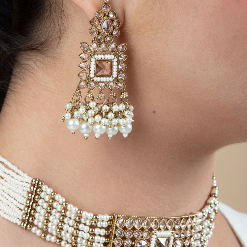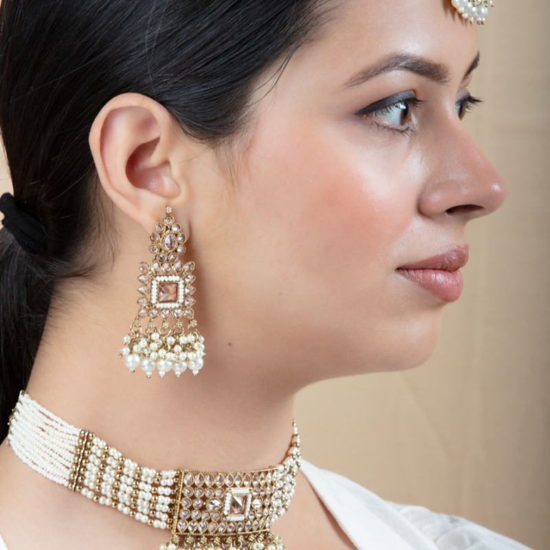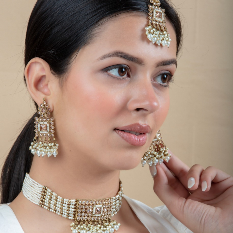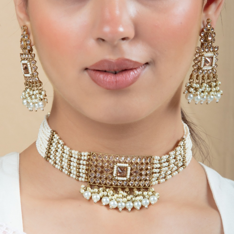 Choker Style: Sits close to the neck, giving an elegant and regal look The necklace is made up of several rows of small white pearls, creating a layered effect.