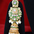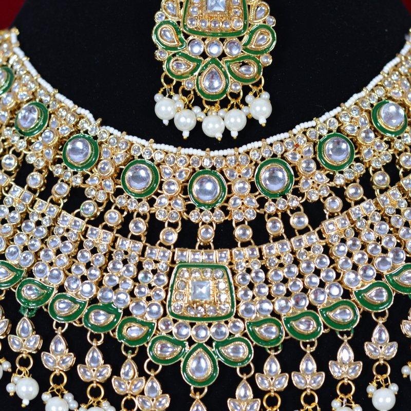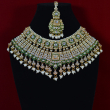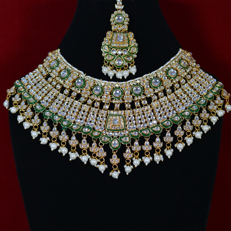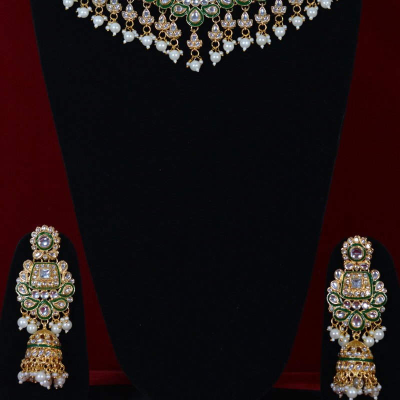 This grand choker set features densely set kundan stones highlighted with green enamel borders. The matching jhumka earrings showcase dome-shaped detailing with pearl and bead drops for added movement. Precise stone setting, layered motifs, and a luminous gold-toned finish give this set a striking bridal presence.