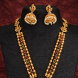 Stunning matte gold long necklace set with matching earrings. The double-strand necklace features intricate gold craftsmanship accented with red and green gemstones and pearl detailing, culminating in a large circular pendant showcasing an embossed goddess motif surrounded by ruby-like stones and pearl drops. Perfect for traditional celebrations and elegant occasions.
