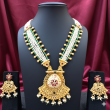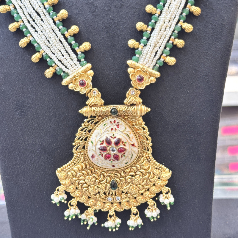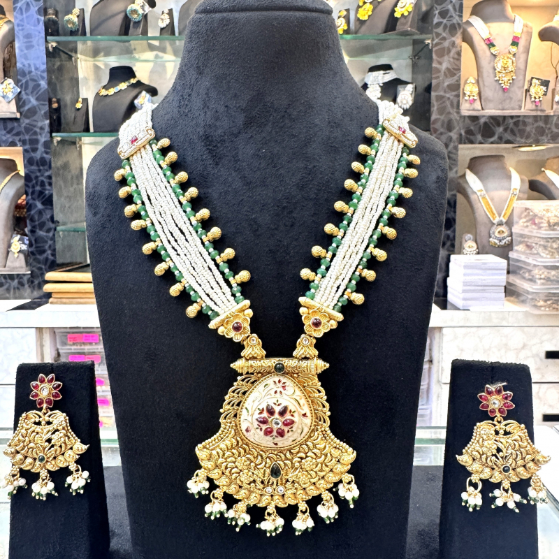 Elevate your festive and bridal look with the magnificent Grand Heritage Temple Haar by Jewora, a jewelry piece that beautifully reflects the opulence of temple artistry. This haar features layered strands of pearls interwoven with green beads, gracefully culminating in a bold pendant with intricate temple carvings and red enamel detailing. The ornate design is finished with dangling accents, offering a majestic and royal appeal.