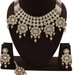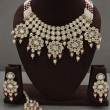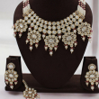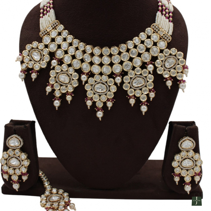 Make a majestic bridal statement with this Grand Polki Pearl Bridal Statement Necklace Set, crafted for brides who love royal elegance. This heavy choker-style necklace features multiple layers of round Polki-style stones, beautifully arranged in a bold, structured pattern.