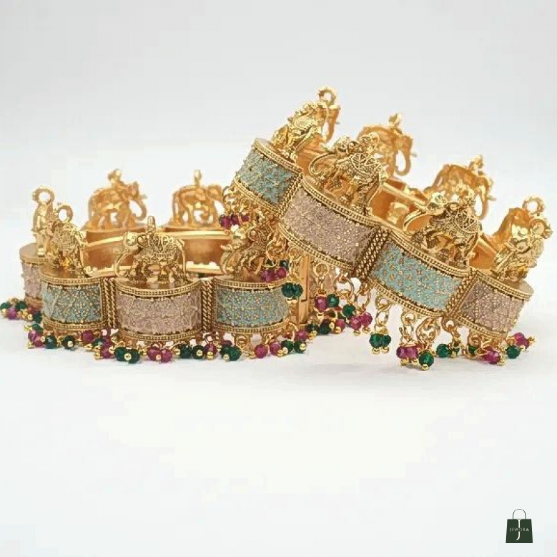 Premium gold plating with temple art. Beautiful pastel pink and blue enamel panels. Designed to enhance your pooja attire .
