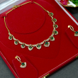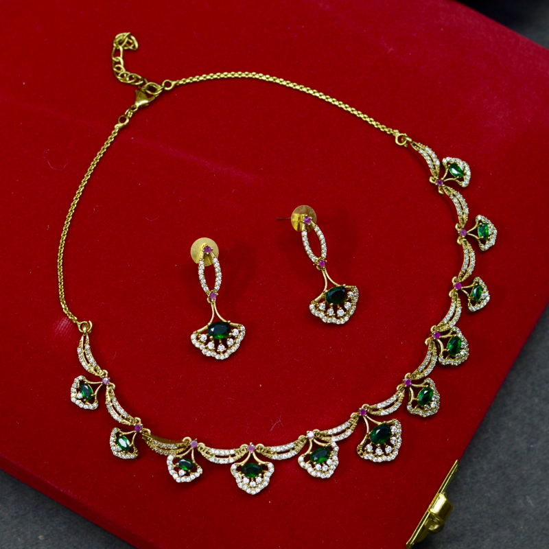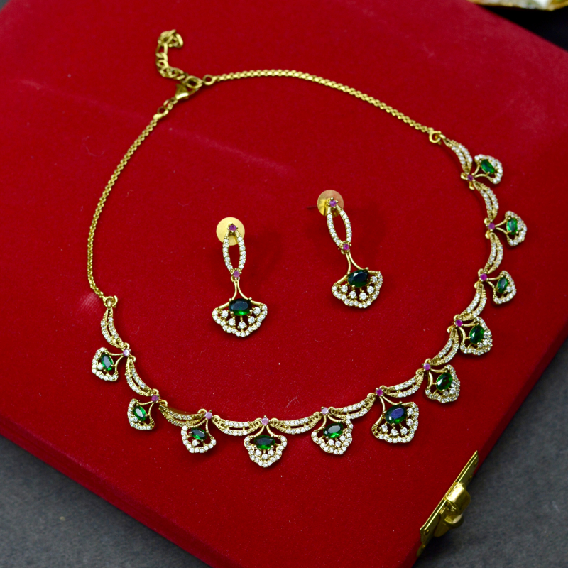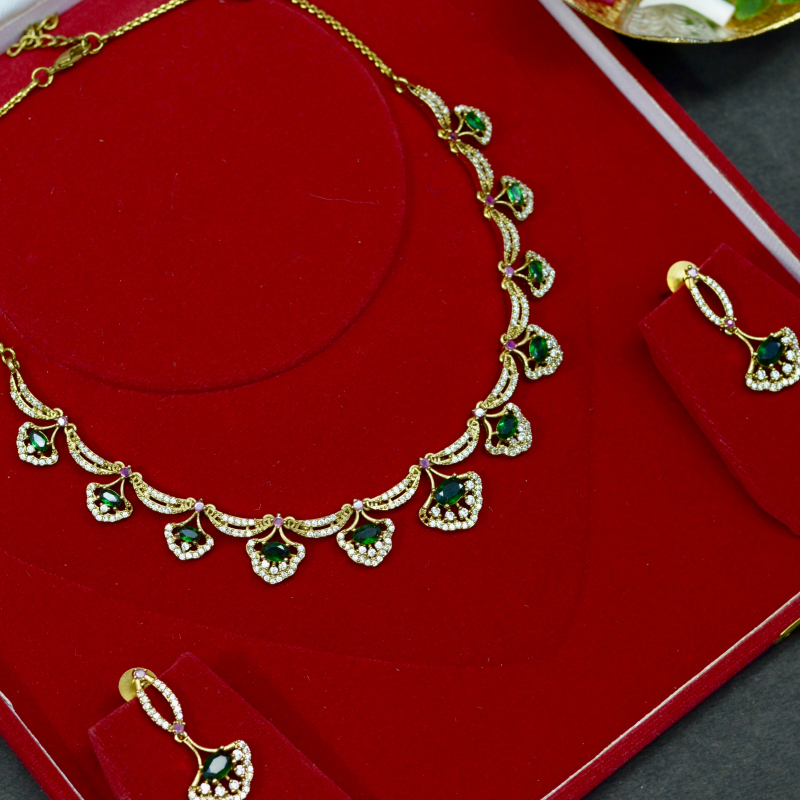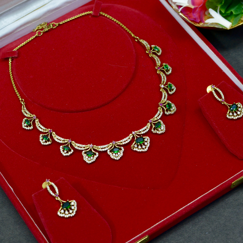 This Green Drop Traditional Necklace Set highlights vibrant green stones paired with elegant gold-tone detailing. Designed for classic appeal, it delivers a luxurious festive look with graceful movement, making it perfect for traditional outfits, ceremonies, and special occasions at a comfortable price range.