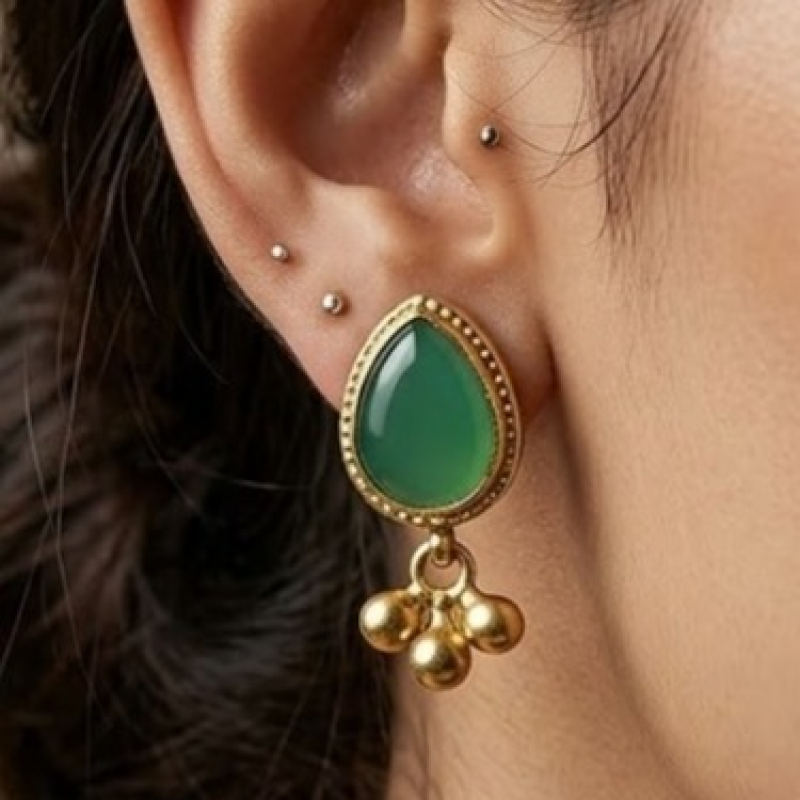 Beautiful brass polished necklace featuring a unique parrot shape pendant with green stone detailing. Comes with matching earrings. Perfect for traditional wear and festive occasions.