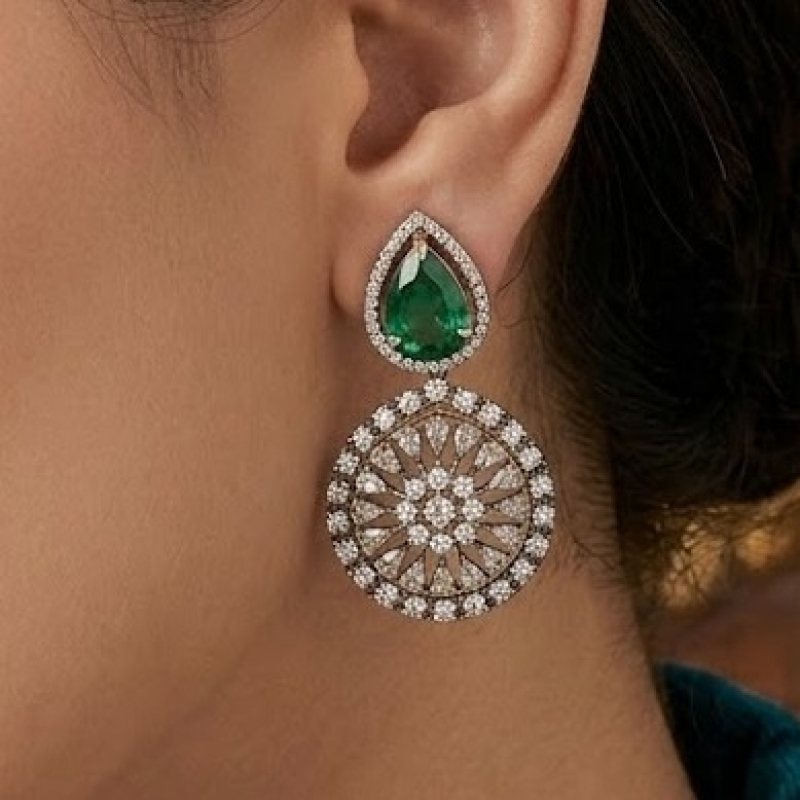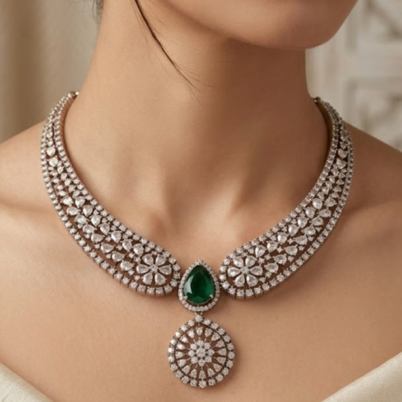 Elegant Victorian polish necklace set with a beautiful green emerald design. Comes with matching earrings. Perfect for weddings, parties, and special occasions.