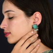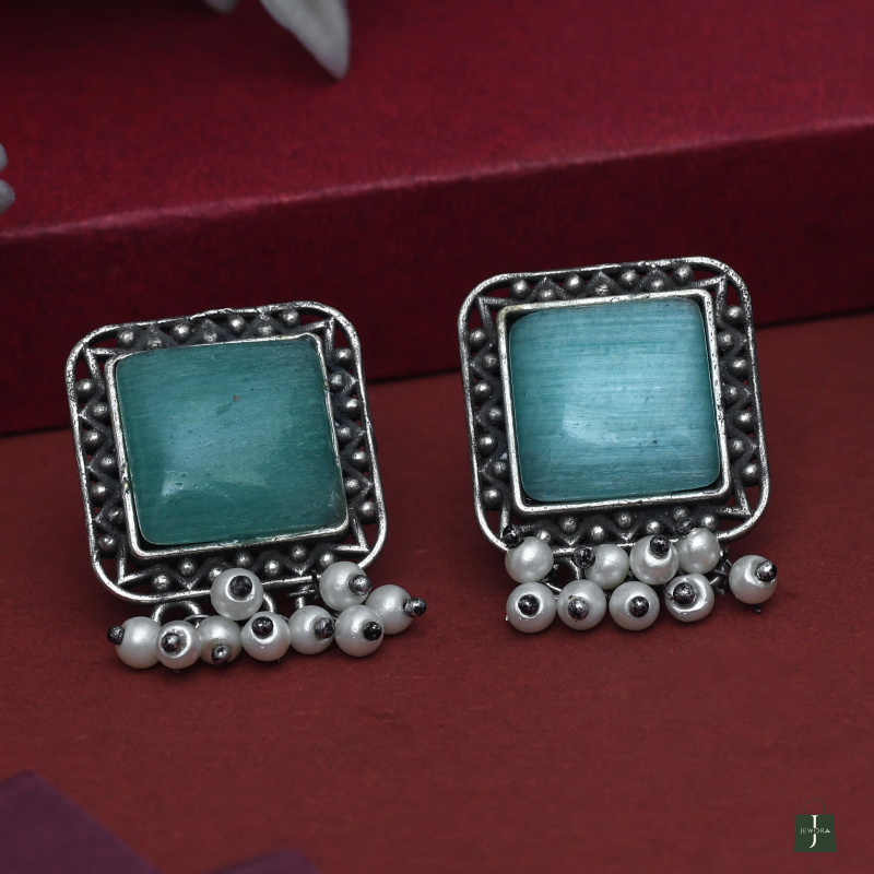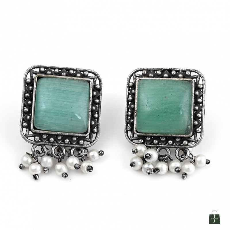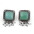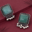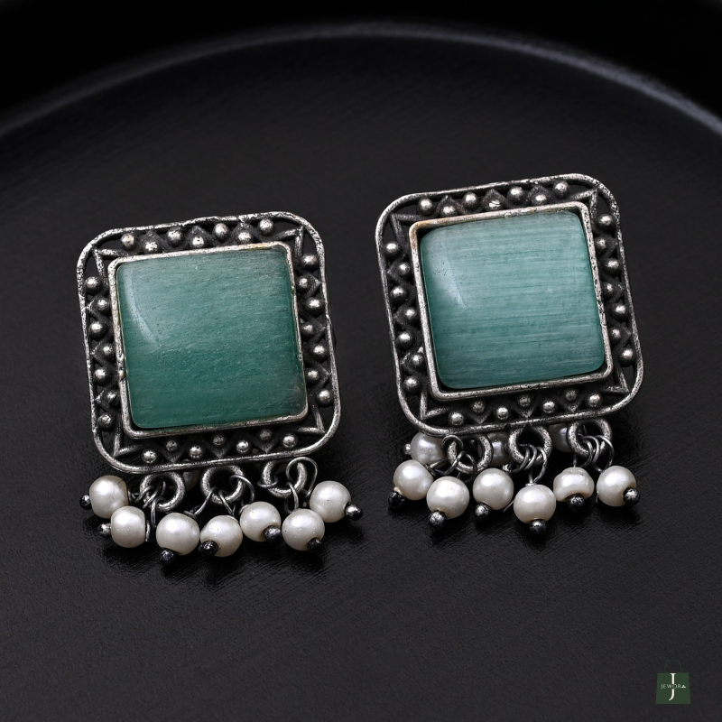 Green Square Stone Oxidized Earrings with Pearl Drops