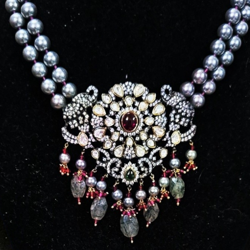 The Grey Pearl and Victorian Necklace is a timeless statement piece that beautifully blends classic elegance with vintage charm. Featuring lustrous grey pearls paired with intricate Victorian-inspired detailing, this necklace exudes sophistication and grace. The antique-style finish enhances its regal appeal, making it perfect for weddings, festive occasions, or evening wear. Each element is carefully crafted to create a harmonious balance of subtle shine and ornate design. Lightweight yet eye-catching, it sits gracefully on the neckline, elevating any outfit effortlessly. Pair it with traditional or contemporary attire to add a touch of royal elegance and refined beauty.