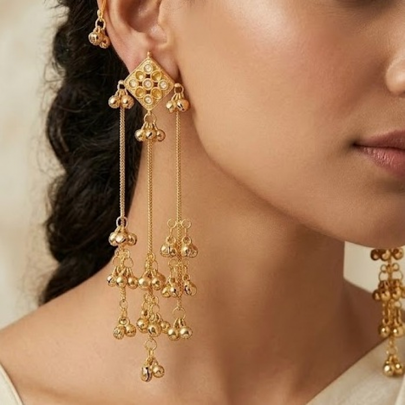 Graceful Brass-Polished Kashmiri Earrings designed with intricate traditional detailing. These elegant earrings feature a beautifully crafted top with delicate pearl accents and multiple chain tassels with small ghungroo-style drops, creating a rich and festive look. Perfect for weddings, celebrations, and ethnic wear, they add charm and elegance to any outfit.