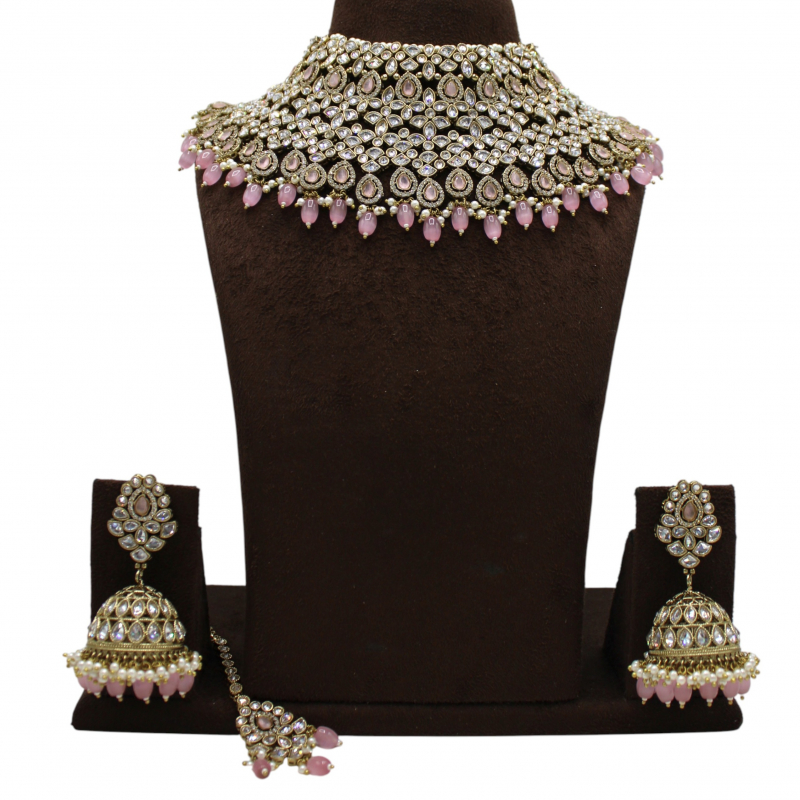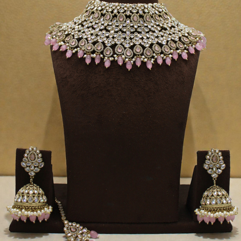The highlight of this set is the soft blush pink teardrop bead drops that beautifully enhance the neckline and add graceful movement. The matching dome-shaped jhumka earrings and coordinated maang tikka complete the set, making it perfect for brides and festive occasions.