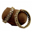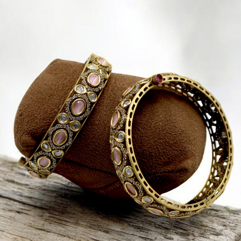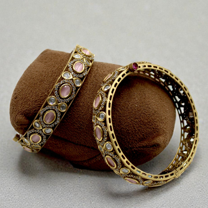 Grace your wrists with timeless elegance through these beautifully crafted blush pink Kundan kada bangles. Designed in a rich antique gold-tone finish, the bangles feature soft oval blush pink stones set harmoniously with sparkling clear Kundan crystals.