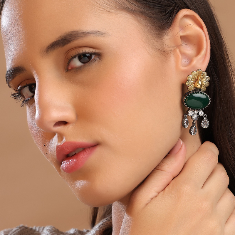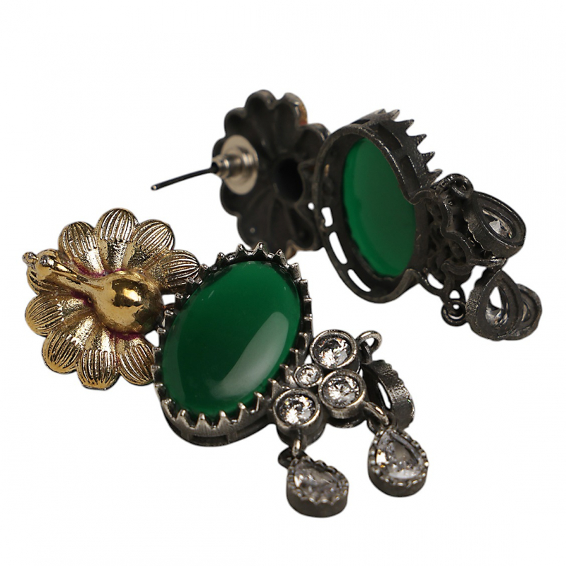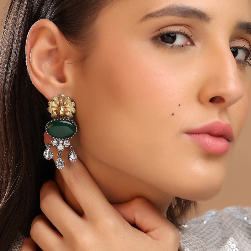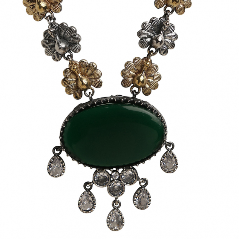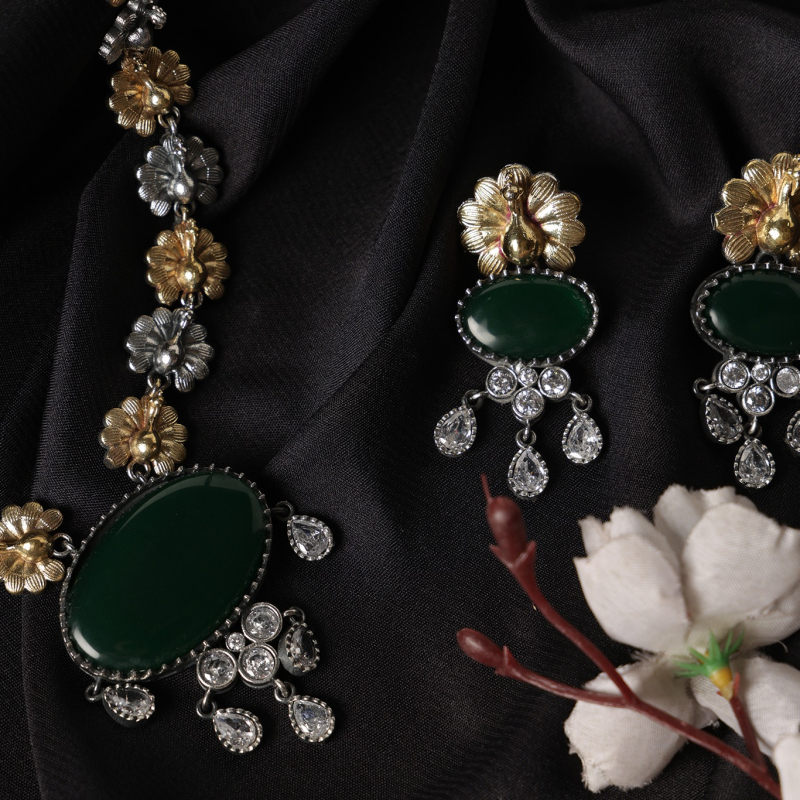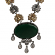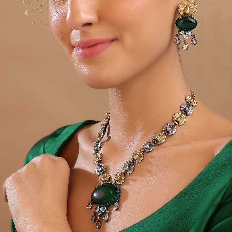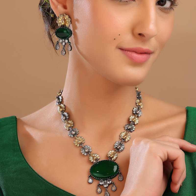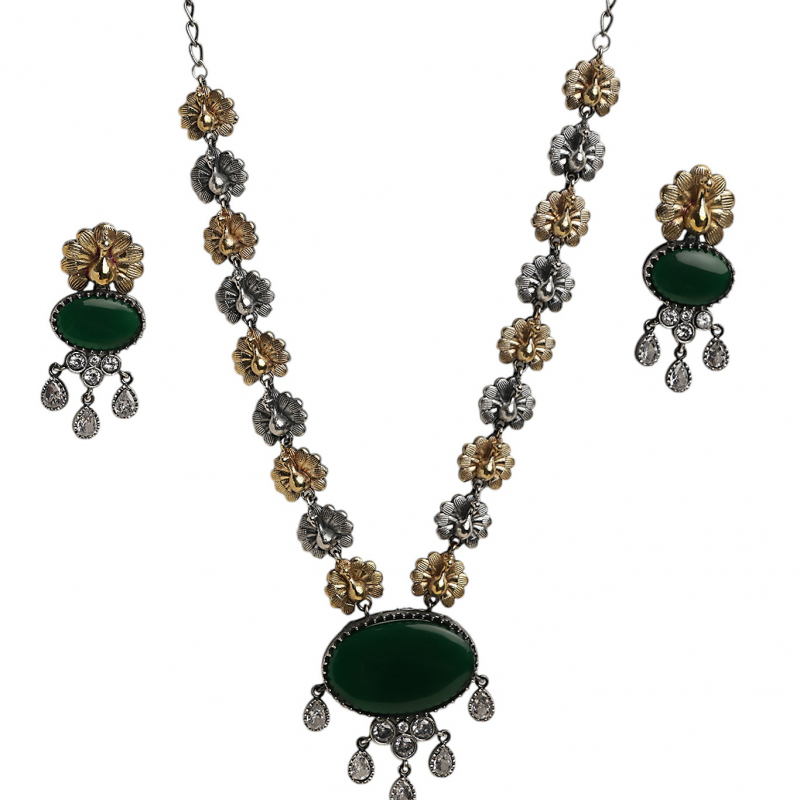 Bring timeless elegance to your look with this beautifully crafted floral necklace set. Designed with intricate flower motifs in a unique dual-tone finish, this piece is highlighted by a rich green oval stone pendant and delicate dangling accents. The combination of antique gold and oxidised silver tones adds a vintage charm, making it perfect for both traditional and contemporary styling. Paired with matching floral drop earrings, this set is a true statement of grace and sophistication.